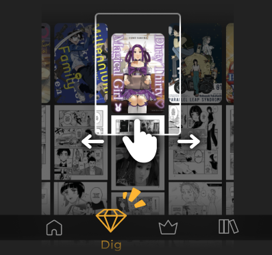 Q: What’s the difference between vertical and horizontal swiping? A: Horizontal swiping allows you to switch between multiple titles to find your favorite manga. Vertical swiping allows you to read through the highlighted sections of that title.